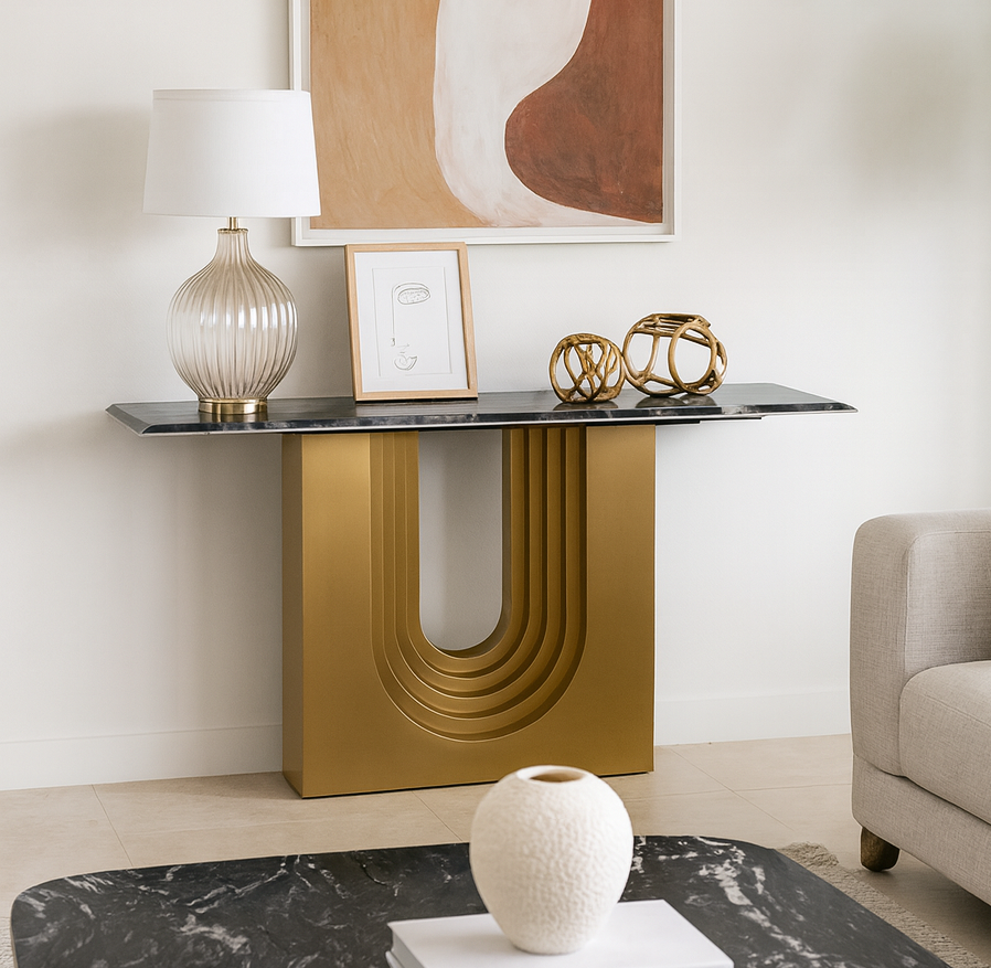 The Solara Luxe Console Table is a stunning fusion of modern sophistication and timeless artistry. Its sleek black marble top with natural veining sits gracefully upon a sculptural brushed gold metal base, designed in a cascading U-shaped form that radiates elegance and architectural depth.