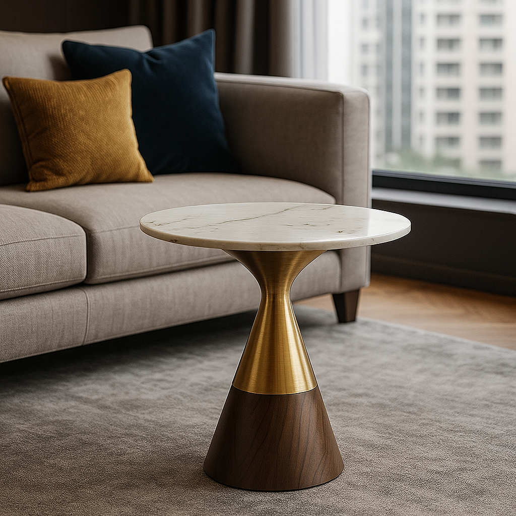 This Sculpted Hourglass Accent Table is a modern side table featuring a striking conical base that transitions from rich wood at the bottom to a brushed gold metallic midsection, creating a warm yet luxurious look. The tabletop is a smooth, round slab of white marble with subtle natural veining, adding elegance and sophistication. Its sculptural design makes it both a functional surface for placing drinks or décor and a bold statement piece in any contemporary living room.