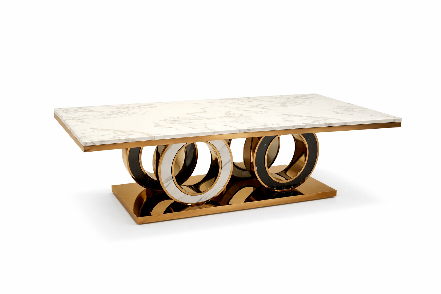 What truly sets the Lunaro apart is its architectural ring base. Crafted from high-grade rose-gold stainless steel, the base features a sequence of sculptural circular forms that create a bold visual statement. The design is elevated further with contrasting white and black marble inlays, adding richness and balance to the metallic structure while enhancing its artistic appeal. The rings rest on a glossy rose-gold platform base, reflecting light beautifully and reinforcing the table’s luxurious presence.