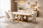 The Lunaro Marble Dining Table is a striking expression of modern luxury, designed to transform any dining space into a sophisticated centerpiece. Featuring a premium marble top, the table showcases elegant natural veining that adds depth, character, and timeless beauty. The sleek rectangular surface is framed with a refined rose-gold stainless steel border, giving it a polished and contemporary look.