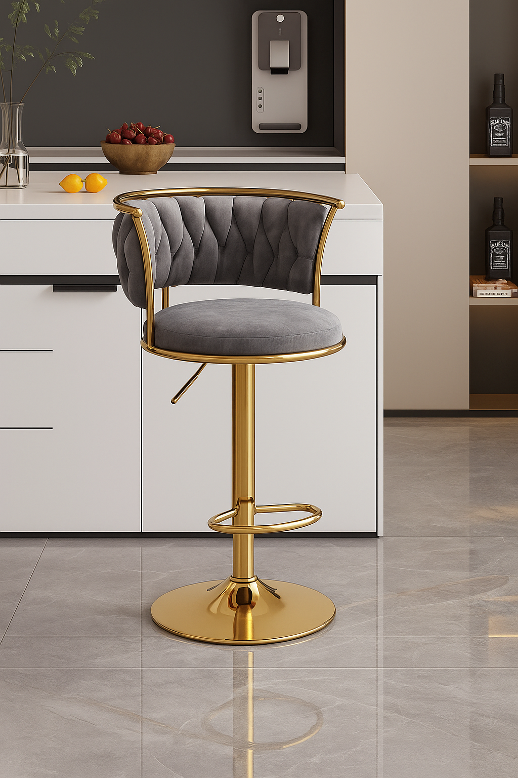 The Monarch Tufted Bar Stool blends regal elegance with contemporary finesse. Its plush, channeled backrest features deep tufting that wraps around the sides, offering both comfort and visual grandeur. Framed in gleaming gold with a curved metal accent, the structure stands out with its polished circular base and matching footrest, providing adjustable height and 360° swivel functionality. The soft, velvet-upholstered seat completes the luxurious look, making this stool an ideal addition to upscale kitchen islands, cocktail lounges, or modern bar settings.