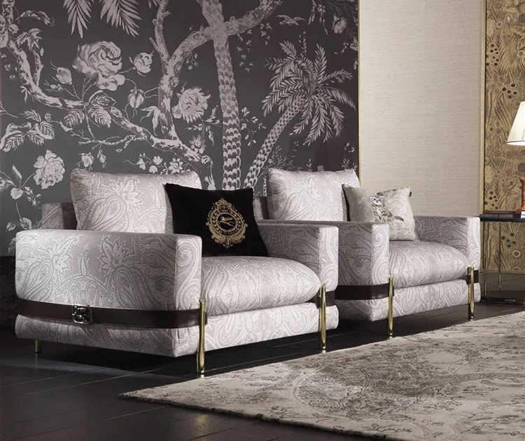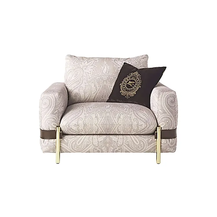The Regal Crest Armchair exudes a sophisticated charm with its intricate paisley-patterned upholstery in soft beige tones. Designed for comfort and luxury, it features plush, oversized cushions and wide armrests, making it ideal for lounging. A dark brown accent pillow with an embroidered royal crest adds a bold contrast and an aristocratic flair. The chair is further elevated by sleek gold-finished metal legs and supportive straps around the arms, which not only enhance its stability but also add a contemporary designer touch. This statement piece blends classic elegance with modern finesse—perfect for luxurious living spaces or boutique interiors.