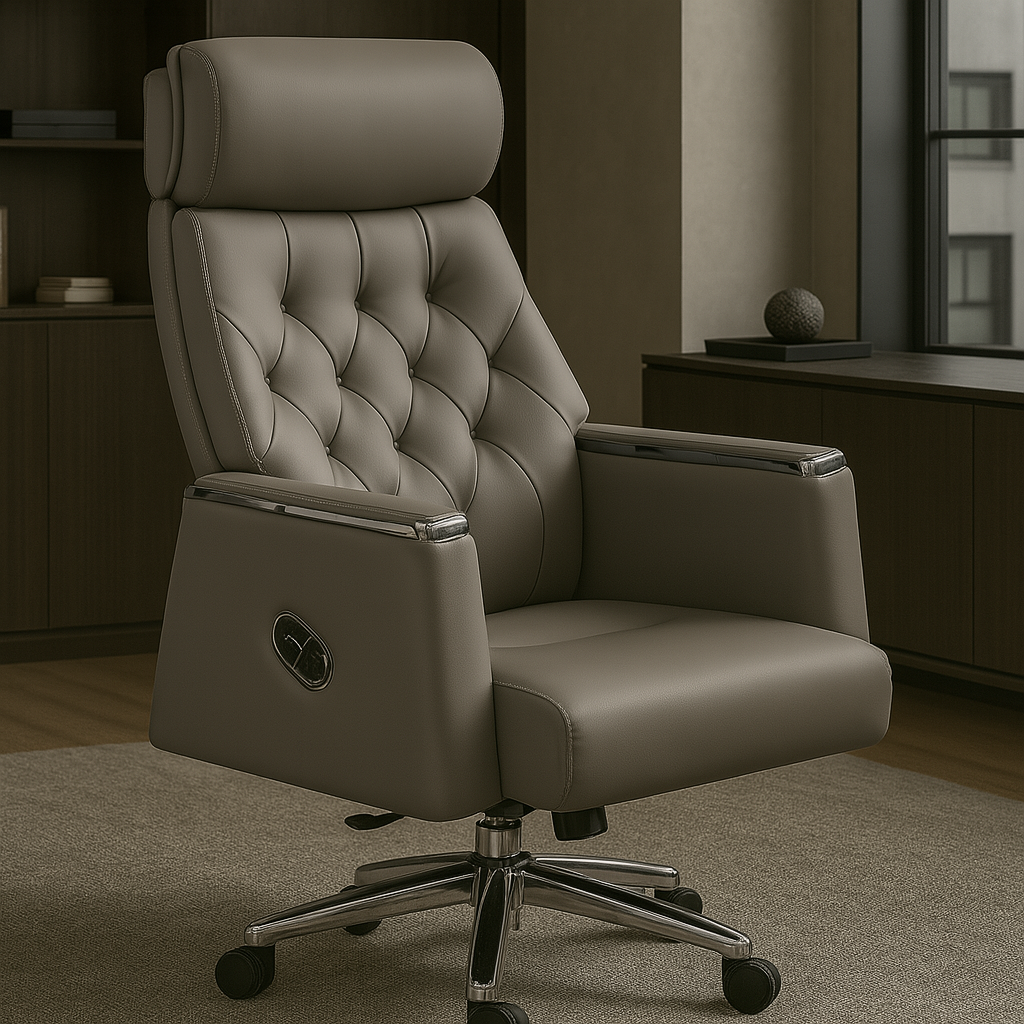 The RegalGrid Comfort Executive chair is a masterclass in luxurious functionality, crafted for modern leaders who value both style and support. Upholstered in smooth taupe-gray leatherette, its high-back design is accentuated by an elegant diamond-tufted pattern, adding a touch of traditional sophistication to its contemporary form. The generously padded headrest and thick seat cushion provide exceptional comfort during long work hours, while the chrome-accented armrests offer sleek visual contrast and tactile refinement. Side controls and a sturdy reclining mechanism allow customizable seating angles, and the chrome five-star base ensures stability with smooth-rolling casters. With its executive presence and ergonomic finesse, this chair seamlessly blends form, comfort, and authority in any modern office setting.