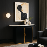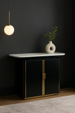 The Seraph Console is not just a statement of elegance but also of practicality. Beneath its polished white marble top, the console houses spacious storage compartments hidden behind sleek ribbed doors. The soft-close mechanism and brushed gold handles ensure a seamless user experience while keeping the design minimal and uninterrupted.