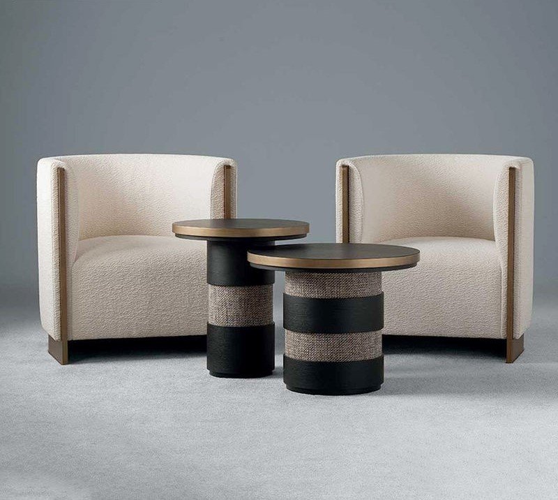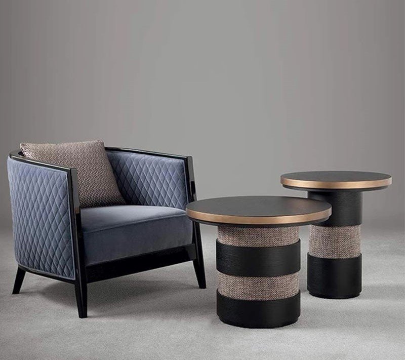 The Strata Barrel Tables are a bold and tactile pair that embody contemporary sophistication through layered textures and geometric form. Featuring cylindrical bases wrapped in alternating bands of textured fabric and matte black wood, they resemble modern architectural columns. The tabletops are sleek and minimal, finished in a dark tone with a refined metallic rim that adds a hint of luxury. Their sturdy yet stylish build makes them ideal as side or accent tables, blending seamlessly into interiors that value both comfort and craftsmanship. Paired with a quilted lounge chair, they evoke a tailored, upscale lounge aesthetic.