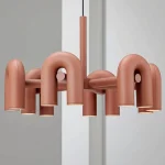 The TerraLoop chandelier is a bold statement piece inspired by modern sculptural design. Featuring six U-shaped tubular arms in a matte terracotta finish, this fixture evokes the look of industrial piping reimagined with a soft, artistic twist. Each arm gently curves downward, housing recessed LED lights that cast focused illumination beneath.
