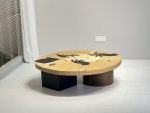 Its distinctive dual-base design — combining a rounded wood form with a sharp geometric block — brings a perfect harmony of softness and strength. This table serves as both a functional centerpiece and an artistic statement, ideal for modern interiors that appreciate craftsmanship and symbolism.