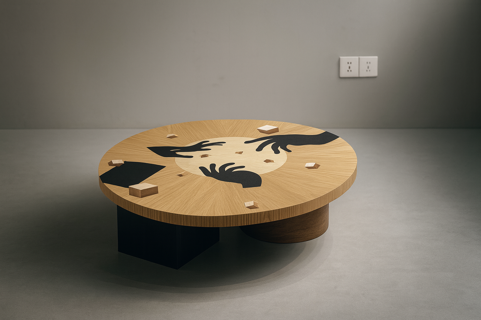 The Unity Hands Coffee Table symbolizes connection and creativity through its bold, artistic design. Crafted from premium wood veneer, the tabletop features a stunning hand-inlay pattern in contrasting black and natural oak tones, representing unity and balance.